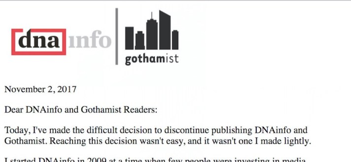 In addition to shutting down the sites and firing over a hundred employees, journalists can no longer access their published work. “All other articles promptly vanished from the sites,” reported the New York Times. “[A]n official at DNAinfo said they would be archived online.” Countless former and freelance journalists who have written for both Gothamist and DNAinfo have also been greatly affected. Those news articles are vital for job applications, interviews, and career opportunities. Journalists are frantically searching for ways in which to preserve their body of work. It’s one of the ugly realities of online-only journalism. [Update on Nov 3: As of this afternoon, archives for both DNAinfo and Gothamist and are currently online.]