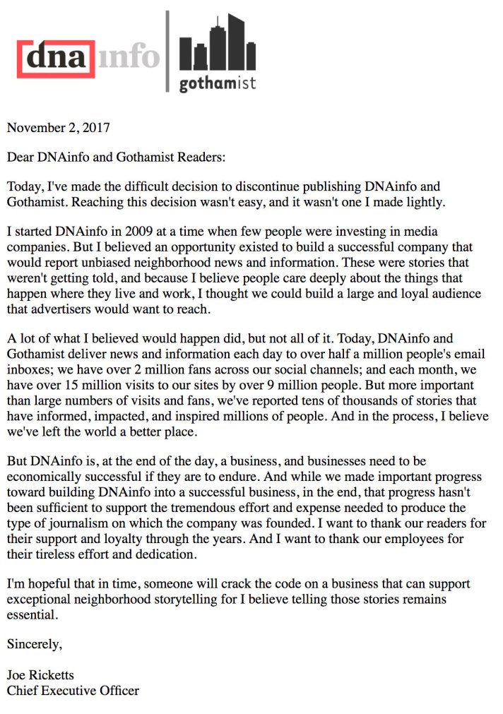 “DNAinfo is, at the end of the day, a business, and businesses need to be economically successful if they are to endure,” Ricketts wrote. And just like that, hundreds of thousands of articles disappeared from these two sites.